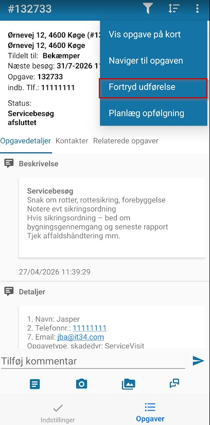 Hvis man ved en fejl har udført servicebesøget kan man genåbne en afsluttet opgave med handlingen Fortryd udførelse.