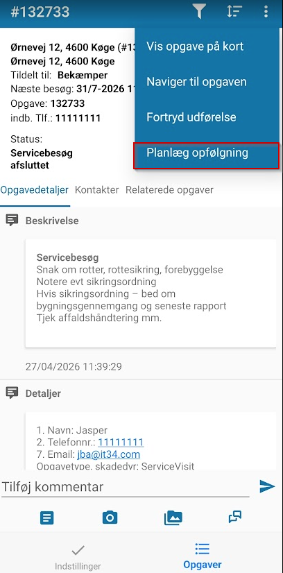 Hvis man ønsker at planlægge et opfølgende servicebesøg på adressen anvendes handlingen Planlæg opfølgning.