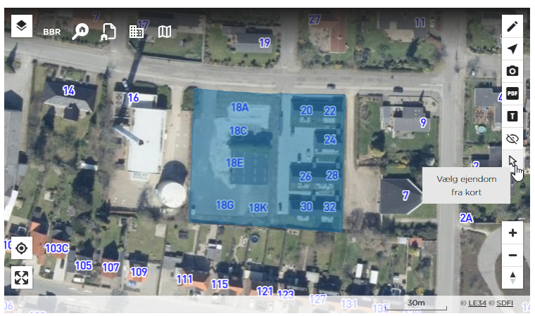 Du bruger værktøjet direkte i kortet og kan på den måde klikke et sted i kortet og søge ejendommen frem som sit eget faneblad. Det virker også for ejerlejligheder osv.